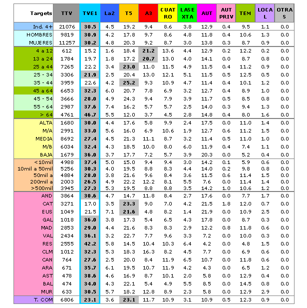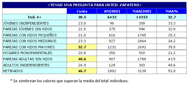 Asimismo, en el desglose por "ciclos de vida" que estable TNSofres, 'Tengo una pregunta para usted' obtuvo sus mejores registros en el grupo de los retirados, con un 46,7% de cuota de pantalla en este target: