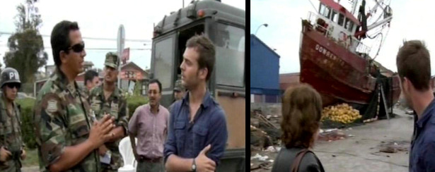 Ernesto y Rosa llegan al aeropuerto de Santiago de Chile en el primer vuelo regular desde España después del terremoto. La situación es complicada, desde Santiago hasta la zona de Concepción hay 500 kilómetros. Lo que en condiciones normales son cinco horas de coche, se convierten en 14 horas de viaje. Aunque Santiago, a priori, no parece muy afectado, en el camino hacia Concepción la cosa cambia. Tráfico enorme, control policial y militar, gente acampada por los bordes de la carretera y terror ante la posibilidad de nuevos temblores. Un terror que vivirán en primera persona cuando se produce una réplica mientras se encuentran descansando en el hotel. El pánico provocado por las réplicas se mezclará con la creciente tensión de Ernesto y Rosa ante la incierta suerte de sus familiares.