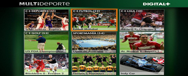 MultiDeporte es un servicio que estará disponible desde el próximo viernes 27 de agosto en el dial 50 de Digital+. Cada una de las ventanas que componen MultiDeporte incluirá además el nombre del canal correspondiente, su dial, la información del programa o retransmisión que se esté emitiendo, e información adicional acerca de los eventos que se están emitiendo en Alta Definición o el resultado del encuentro que esté siendo ofrecido en directo.