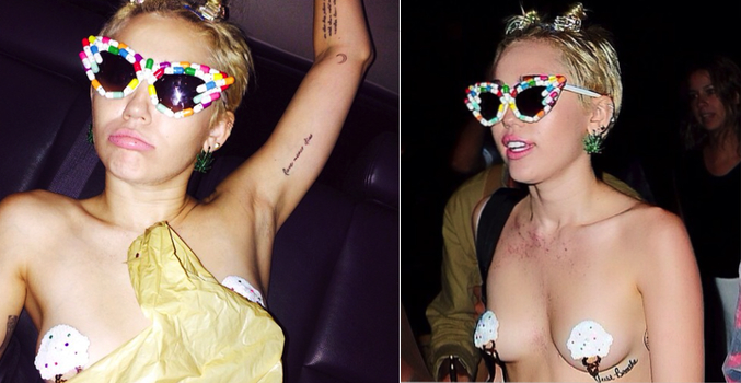 Según se puede ver en diferentes instantáneas publicadas en la cuenta de Instagram de la celebrity, la cantante acudió a dicho evento vestida únicamente con unos pantalones negros y dos pequeñas pezoneras con forma de helado que cubrían sus pechos, dejando a la vista todo lo demás. Para completar su llamativo look, la que fuera en su día protagonista de 'Hannah Montana' optó por unas gafas de sol que contaban con una montura plagada de pastillas y unos pendientes que simulaban la forma de una hoja de marihuana.