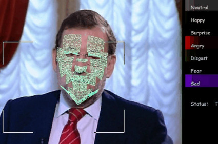 Análisis facial del rostro de Mariano Rajoy con el programa del doctor Nicu Sebe. Las barras horizontales indican el porcentaje de felicidad, sorpresa, ira, asco, tristeza y miedo que componen la expresión del rostro en cada momento.